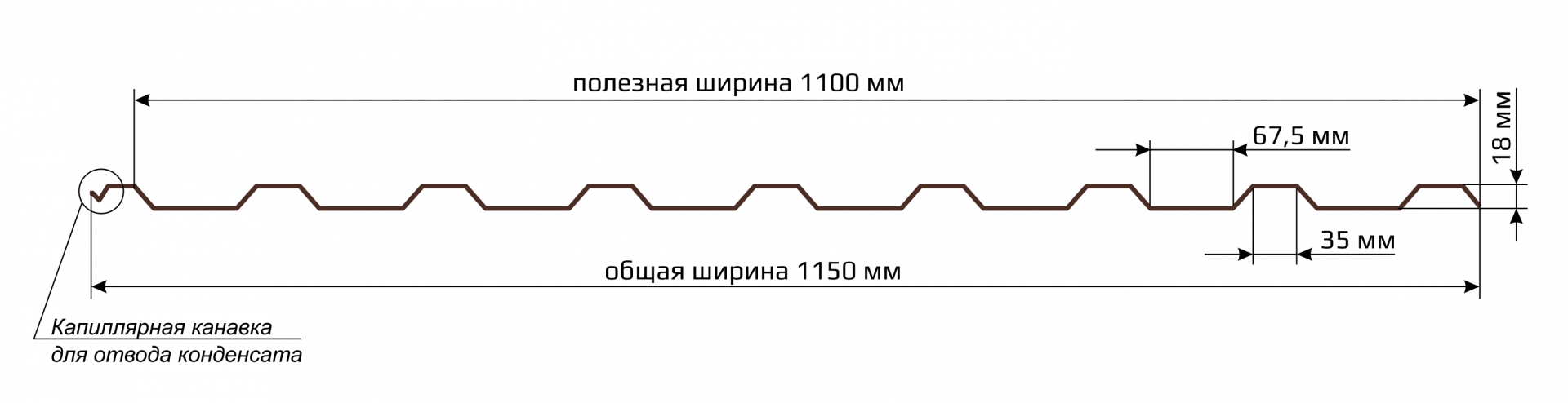 На поперечном срезе листа видно продольное углубление, идущее вдоль волны. При монтаже оно перекрывается соседним листом. Канавка устраняет капиллярный эффект, при котором влага может затекать между плотно прилегающими металлическими поверхностями и попадать под кровлю. За счёт дополнительного углубления вода отводится наружу более коротким и безопасным путём.