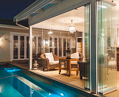 Поворотно-складная система LARGO Book идеально подойдет не только для прямых, П- и Г-образных линий остекления, но и для самых нестандартных полукруглых и круглых беседок, беседок в форме трапеций и многоугольников. Створки этой системы плавно и тихо двигаются по верхнему и нижнему алюминиевому профилю и складываются по принципу книжки с одной или двух сторон. Заполнение системы возможно как закаленным моностеклом 8 или 10 мм, так и стеклопакетом 28 мм. Система полностью безопасна и надежна для проемов большой высоты: безрамное остекление может противостоять ветру скоростью до 175 км/ч.