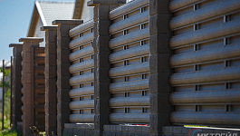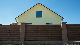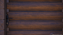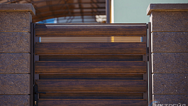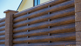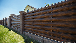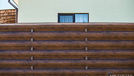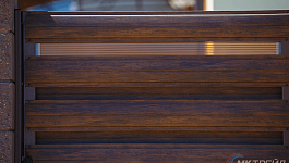 В Дзержинске — необычный привлекающий внимание забор из нашего металлического штакетника Европланка с горизонтальным двухсторонним заполнением из металла премиум-класса «под тёмное дерево» (Тёмный дуб) с гарантией 30 лет.