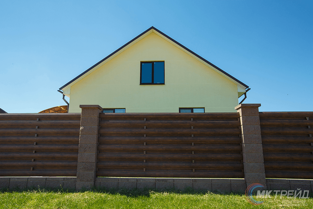 В Дзержинске — необычный привлекающий внимание забор из нашего металлического штакетника Европланка с горизонтальным двухсторонним заполнением из металла премиум-класса «под тёмное дерево» (Тёмный дуб) с гарантией 30 лет.